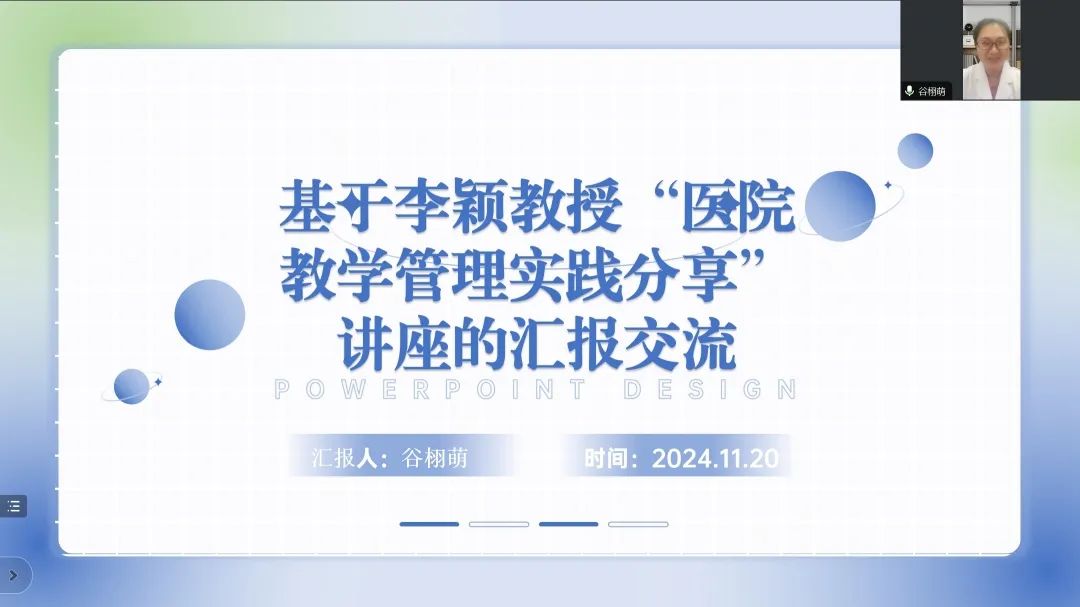 谷栩萌就医院临床教学管理职能和目标,临床教学管理实践中实习管理、课程管理、评价及其应用等方面,将培训中所学习到的先进经验和内容,逐一进行细致的讲解。王浩就两个主题,一方面深入浅出的讲解了虚拟教研室的具体特点,另一方面讲解了文稿写作的基本类型、步骤和思路。