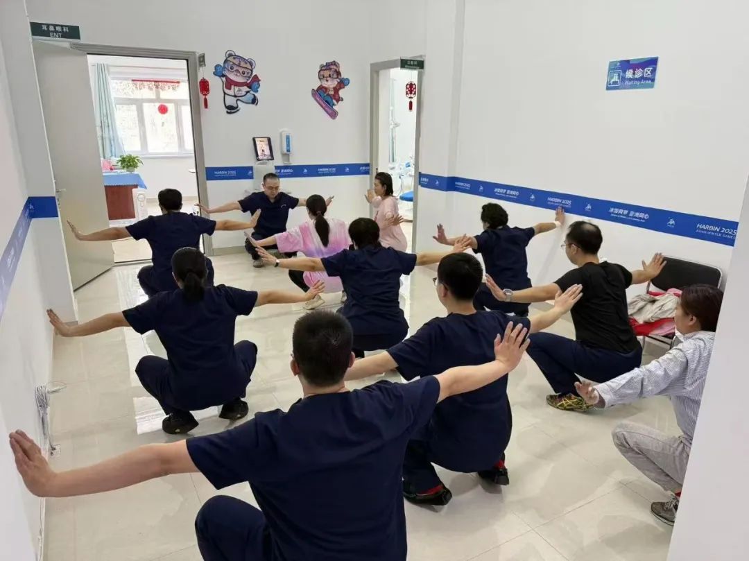 工作期间,为改善诊所内医护人员的身心健康,我院康复中心郭峰医生传授并带领大家练习八卦掌养生十一式,不仅提高了医护人员的身体素质,也把中医养生观念传达给每一位参与保障的诊所工作人员。