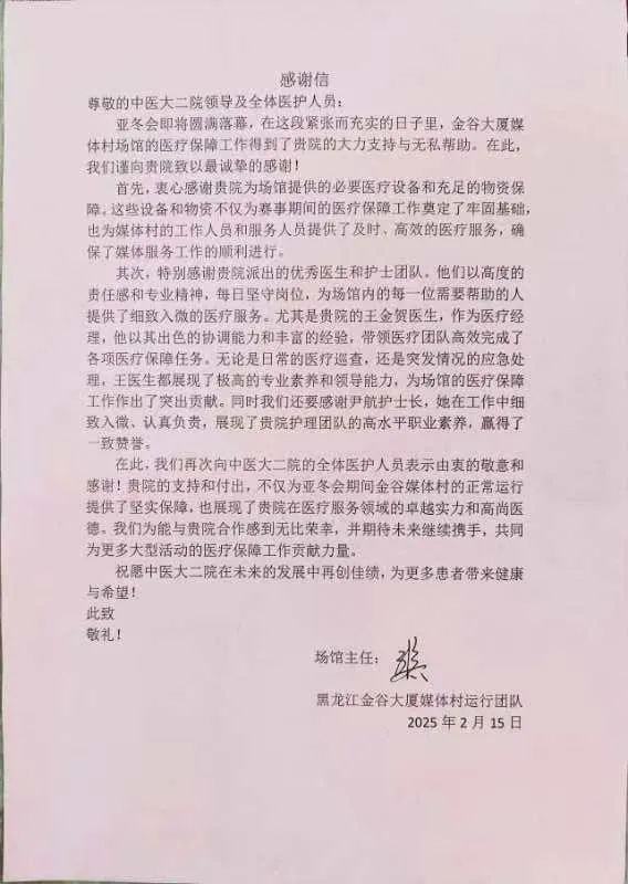 此次中医大二院医疗队圆满完成亚冬会医疗保障任务,不仅展现了我院医护人员的专业素养和团队协作精神,也体现了医院在应对重大赛事医疗保障方面的强大实力。今后医院全体医护人员还将不断提升医疗服务水平,为保障人民群众的身体健康贡献更多的力量。